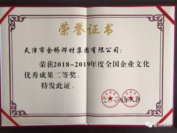 金橋焊材集團榮獲“2018-2019年度全國企業(yè)文化優(yōu)秀成果二等獎”
