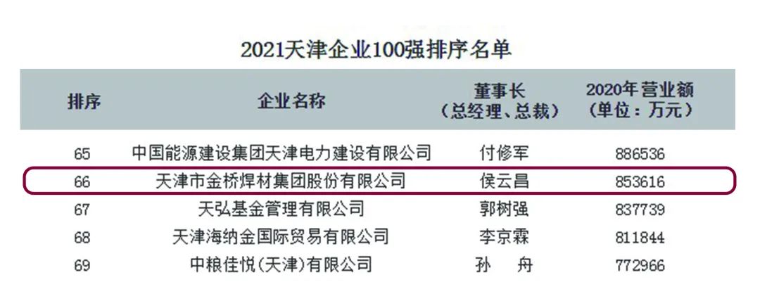 2021年金橋集團再次入選天津企業(yè)100強 天津制造業(yè)企業(yè)100強