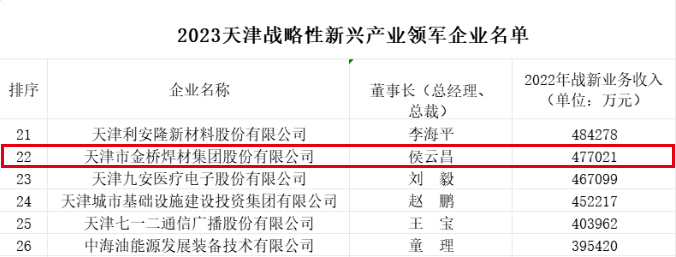 2023年,金橋焊材集團守正創(chuàng)新,拼搏進取,高質量發(fā)展態(tài)勢持續(xù)向好,再次入選天津企業(yè)100強(86名)和天津制造業(yè)100強(36名),天津戰(zhàn)略性新興產(chǎn)業(yè)領軍企業(yè)22名。