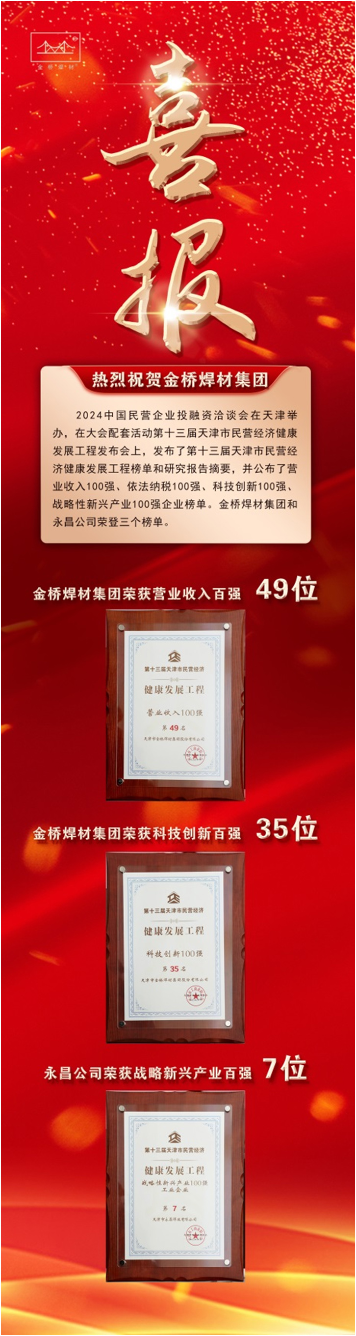 金橋焊材集團入選第十三屆天津市民營經(jīng)濟健康發(fā)展工程多個榜單